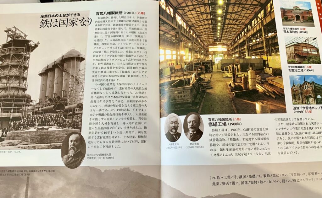 かの有名な「鉄は国家なり」の言葉が。ちなみに、右ページの一番上にあるのが、今回私が訪れることになった、官営八幡製鉄所旧本事務所ですね。