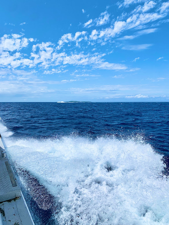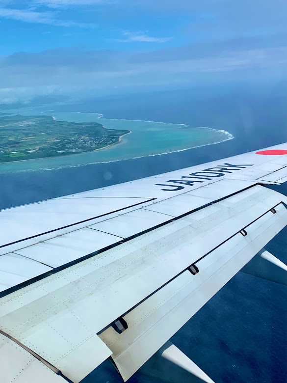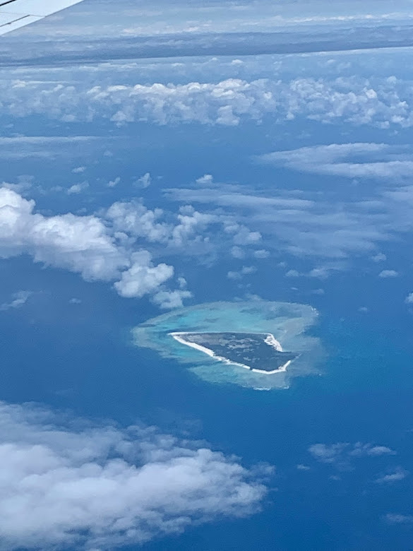 沖縄に近づくにつれ、雲の切れ間に景色が見える時も。きれいなサンゴ礁に囲まれてる島を発見。名称を特定できなかったが…きれいだよな。