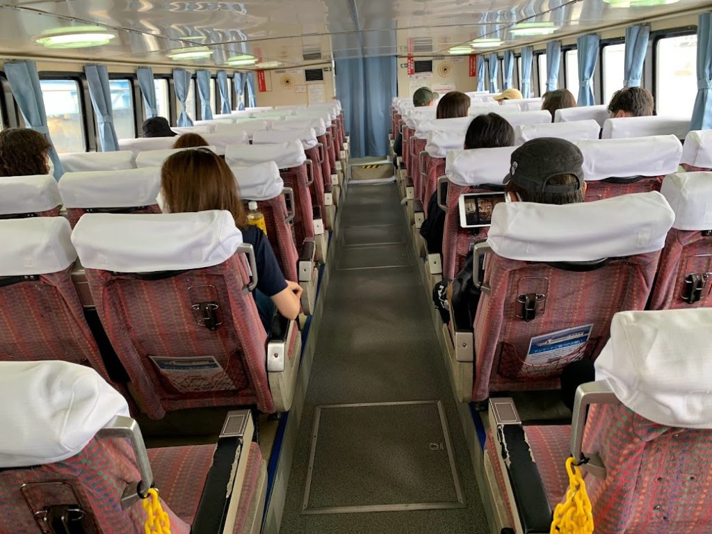 船室。ジーゼル機関がうるさいが、景色を遮るものがないベンチ席を選ぶ。これは大正解だったと思う。なぜなら・・・