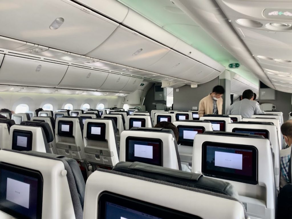 羽田空港8時30発のJAL107便。後方座席のせいか、日曜日出発のせいか、見ての通り、乗車率は低めだな。