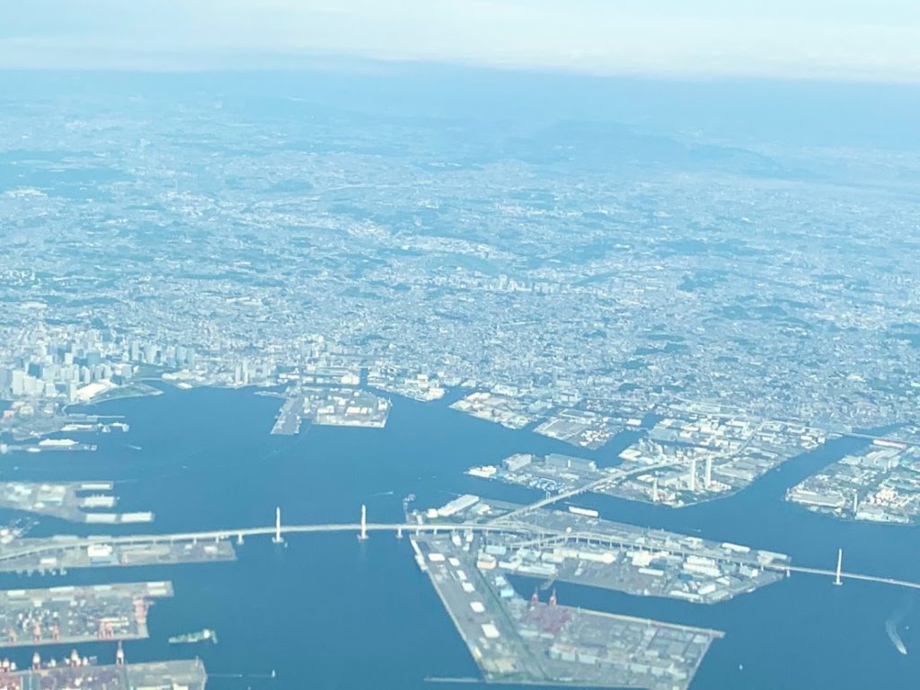 飛行機の車窓から、横浜のベイブリッジ方向を望む。きれいだよな。