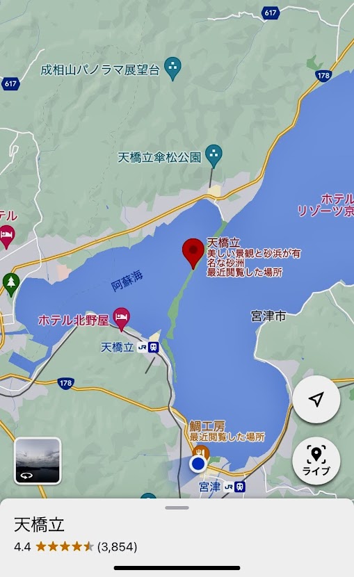 位置関係を。天橋立は徒歩かレンタサイクルで行けるくらいの細い道がある。片道約3.4キロ位らしい。