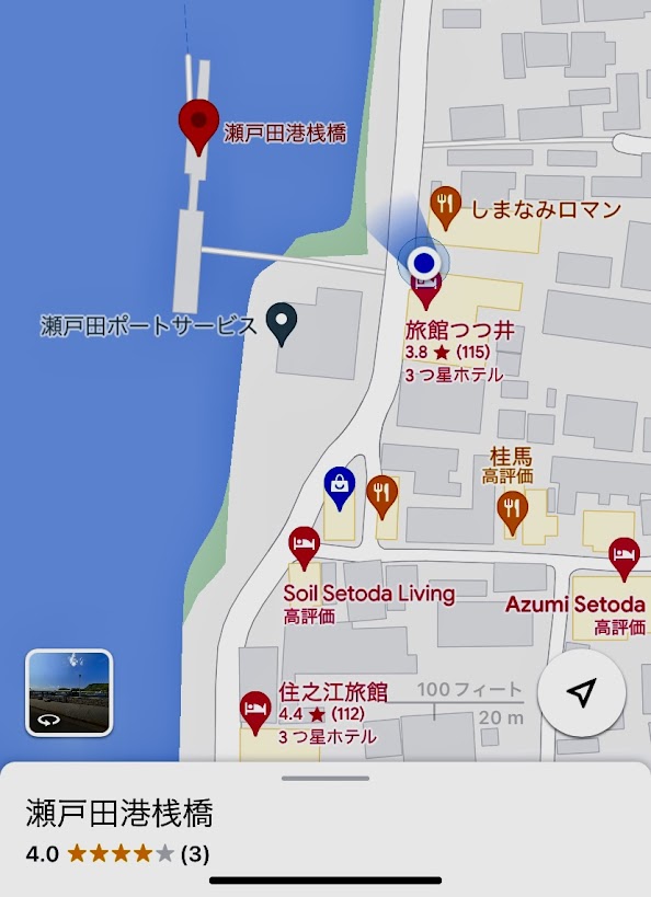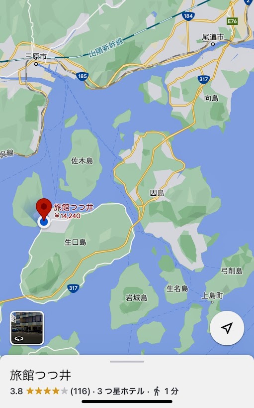生口島・旅館つつ井・瀬戸田桟橋の位置関係を。こんな感じな。