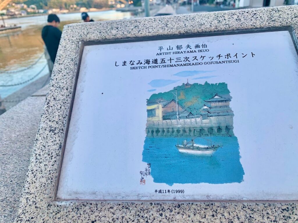 海の際に歩道があって、そこで少年が釣りをしてる。何が釣れるの?と聞いてみたら、小魚、うまくいけばメバル、さらにうまくいけばタイが釣れると。そうなんだ。舗道には、平山郁夫画伯が描いた絵も、飾られていたな。