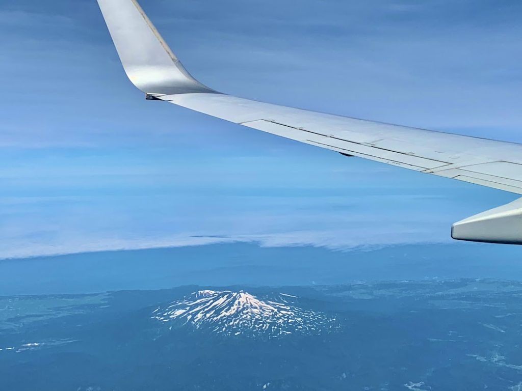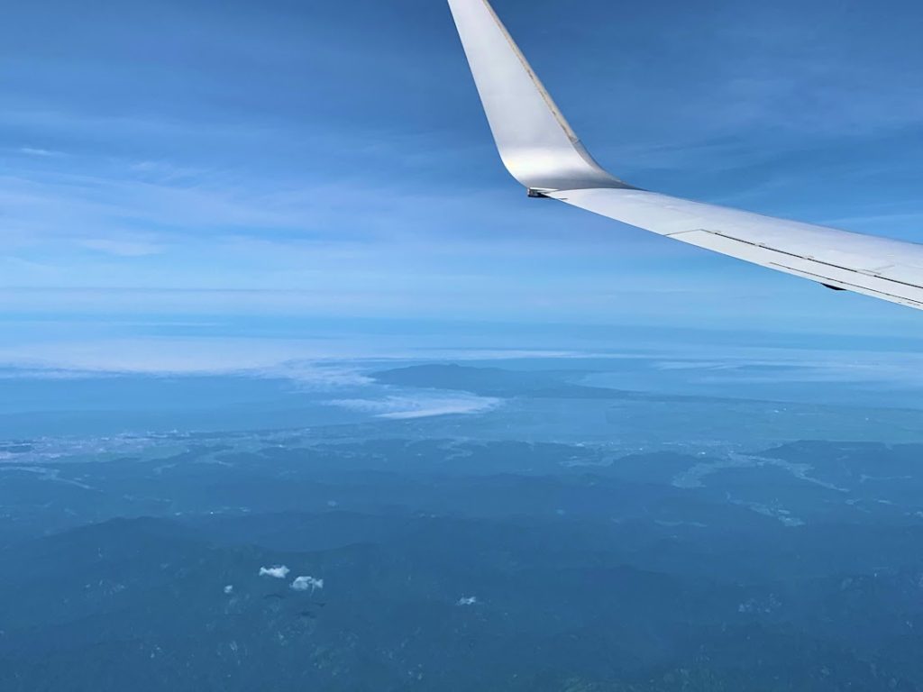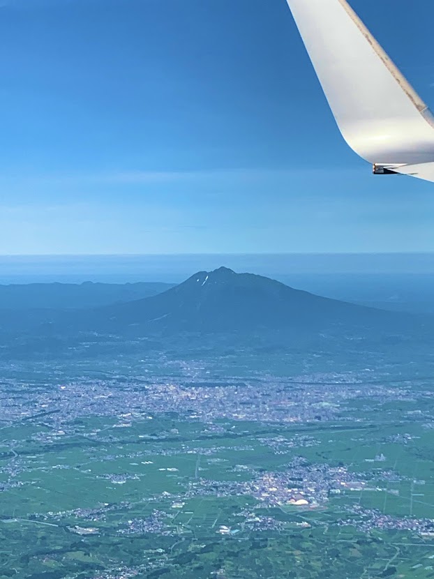 JAL 141便の左側に席を取り、機窓を望む。上から、鳥海山、男鹿半島、岩木山。パイロットの方が親切な方で、「左側には〇〇が見えますね」と、アナウンスをしてくれた。