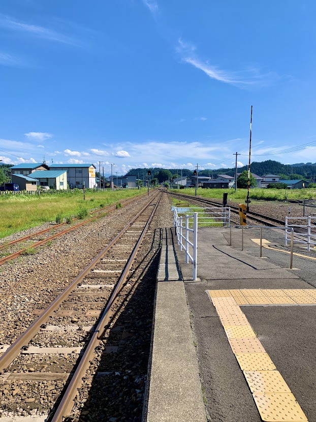 列車は来ない。ホームに佇む。今日は天気がいいな。こちらは花輪線、盛岡方向の眺め。いいよな。