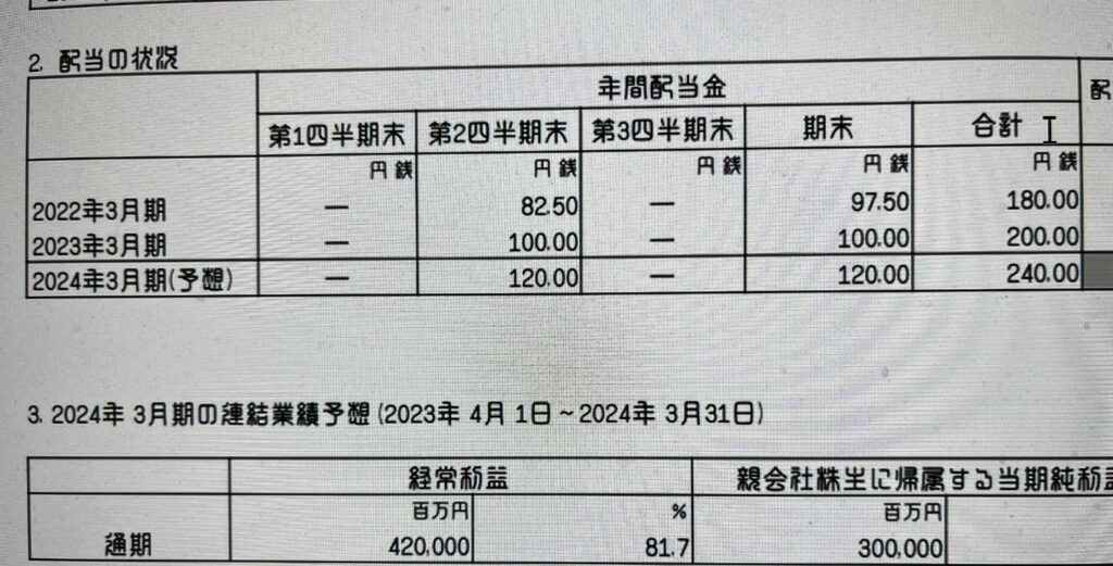 まずは、株探(かぶたん)の決算概要、その下は決算単信の配当と来期の利益見通しを張り付けておきます。