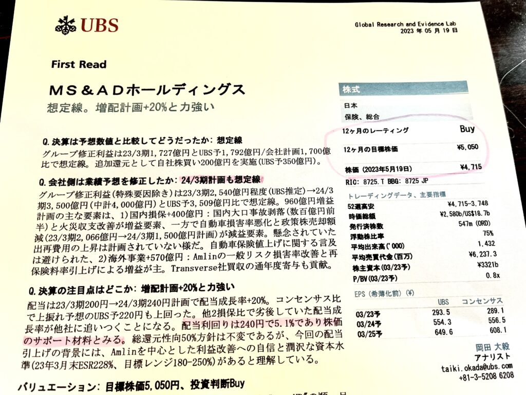 タイトルにある通り、8725 MS&ADがやってくれました!具体的には2024年3月期見通しは、経常利益は80%超増益と最高益へ、で40円増配。また600万株・上限200億円の自社株買い。これは発行済み株式数の1.12%に相当します。