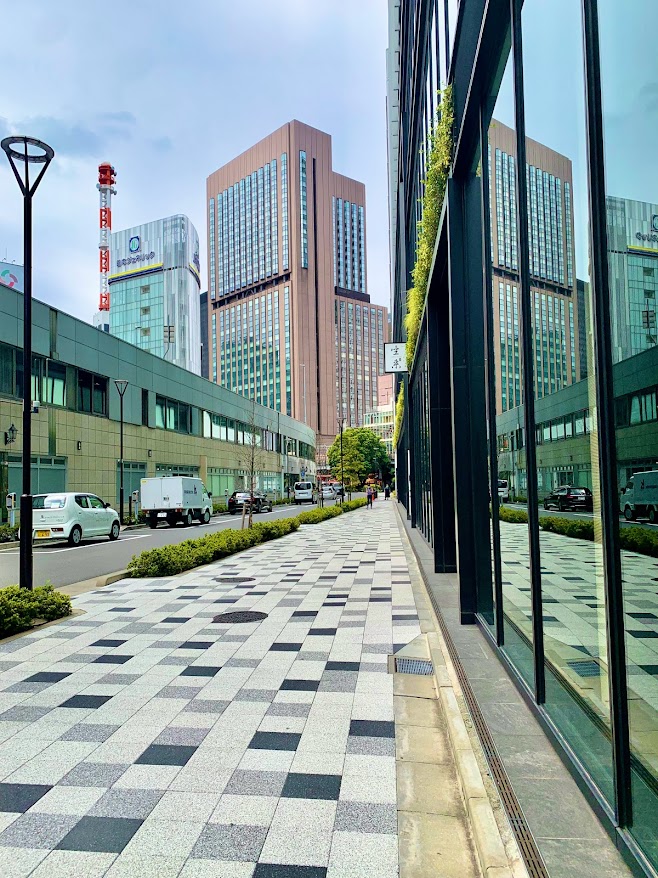 最後の朝の散歩を。上は宝塚ビルの近く、下は銀座のHulicビルから、私が滞在していた帝国ホテル・タワー館を望む。姿がいいよな。