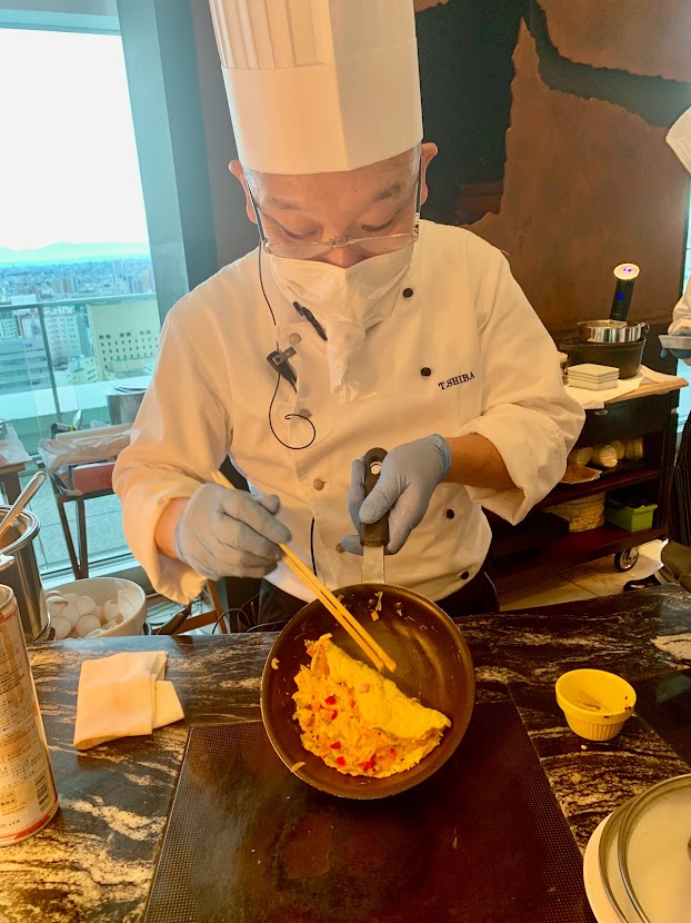 名古屋マリオットのビュフェ朝餉。まずはオムレツを作ってもらう。シェフの腕の見せ所だ。さすがに上手!ソースは選ぶことができるが、ここは名古屋、赤味噌のものを選んだ。期待とおり。美味しな。