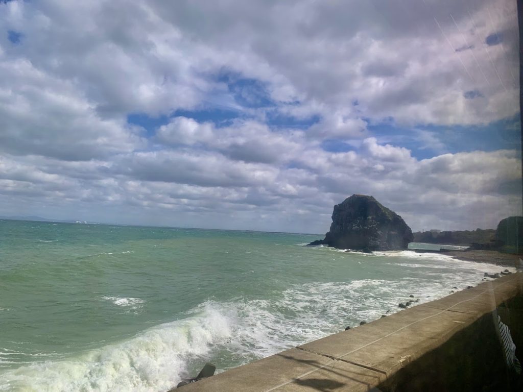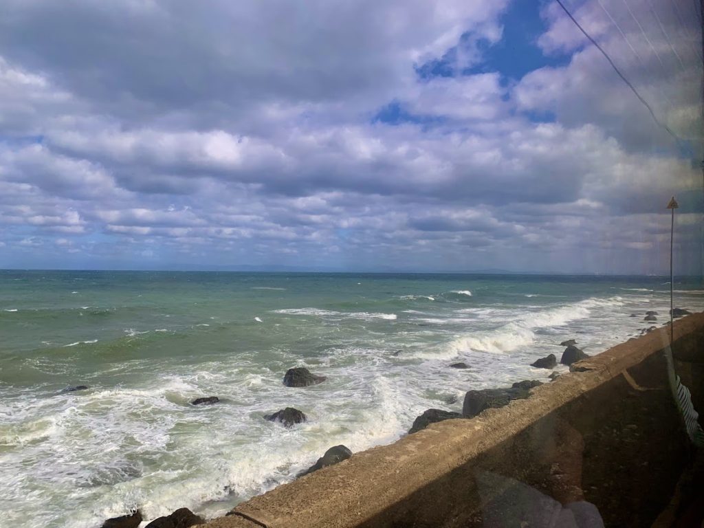 ついに晴れた!函館本線、小樽から札幌方面、日本海を望む。綺麗だよな。乗ってる列車は、JR北海道の快速エアポート。