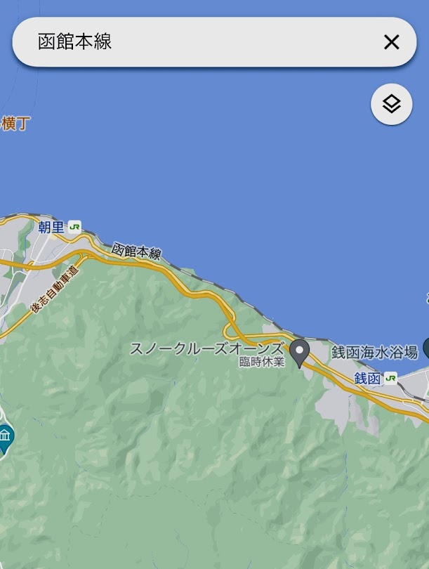 位置関係を。函館本線、小樽~札幌区間内の、朝里~銭函の間。ここは晴れてることを前提にきれいな海が見えるし、雪が降っていると、北海道の冬の厳しさを感じることができるよな。