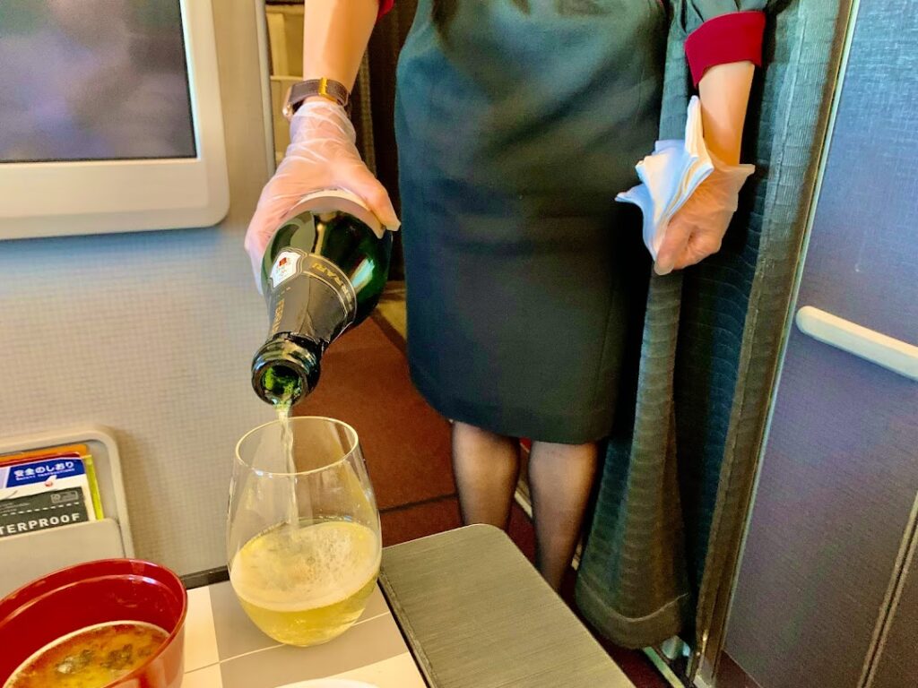 CAさんに、フェラーリ・オマージュのおかわりをいただく。顔も入った写真を撮ってもよかですかと尋ねたら、以前はOKでしたが、今はJALの規定により、ダメなんですよと。なるほどな・・・