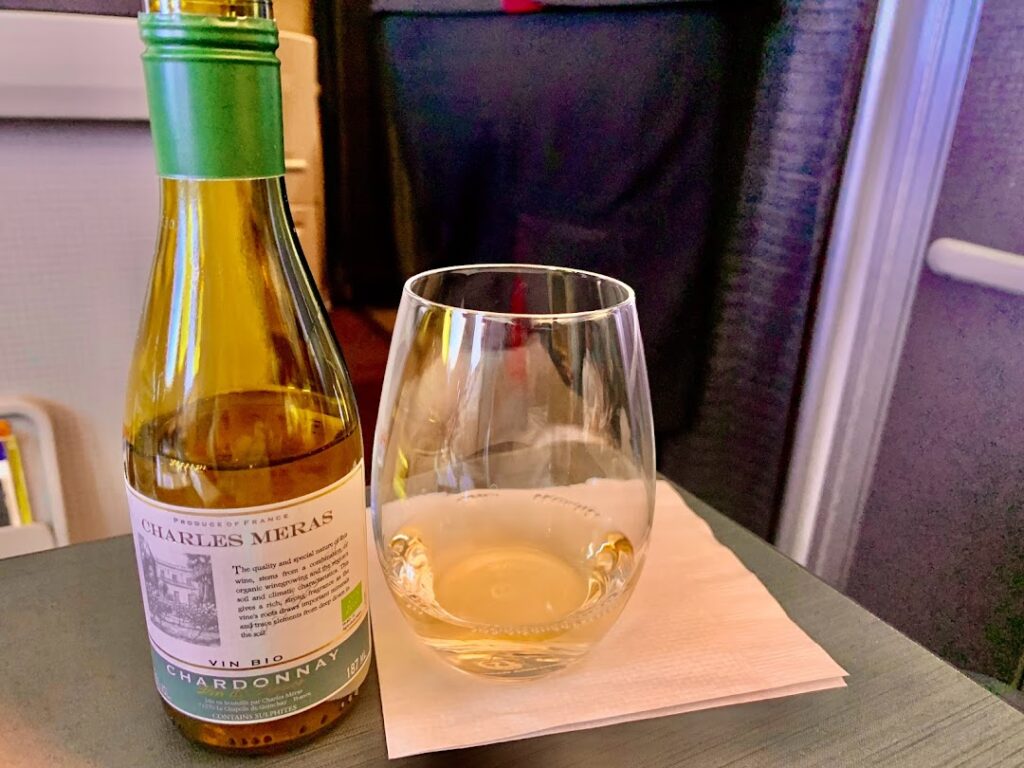 白ワインもいただく。こちらもミニボトルで。フランスのシャルドネ。美味しな。