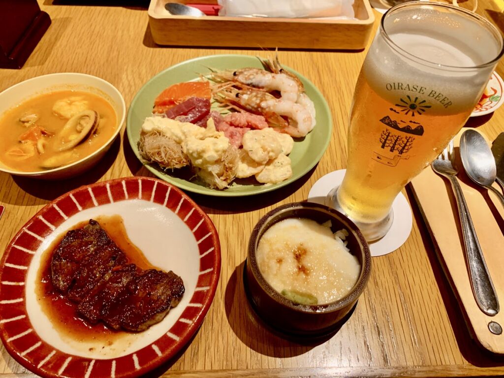 ビュフェ夕餉。左からブイヤベース・牛肉ステーキの赤ワインソース・刺身数点とホタテのフライ・エビマヨ・ご飯の上にとろろをかけたもの。実に美味し。ここのビュフェは、本当に最高。リッツカールトン大阪と名古屋マリオットに匹敵。この中でも・・・やっぱり青森は魚だよな。
