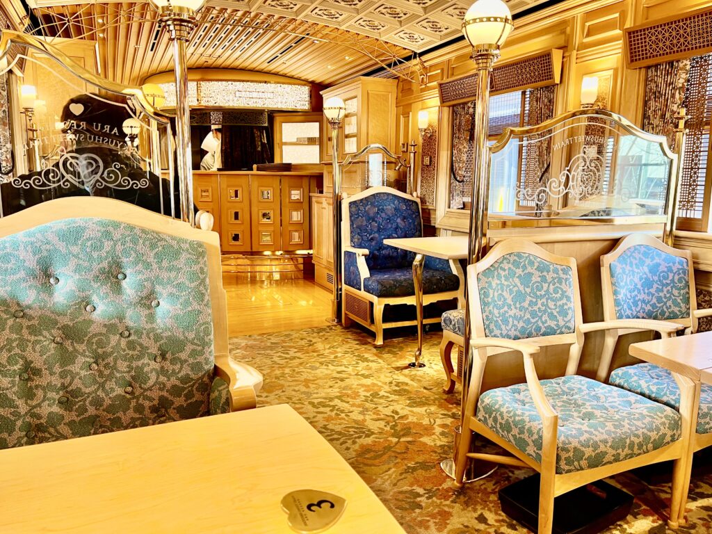 私が座っている席からみた、或る列車の車内。前回とか異なり、きらびやかなほうの車両。良いムードだよな。