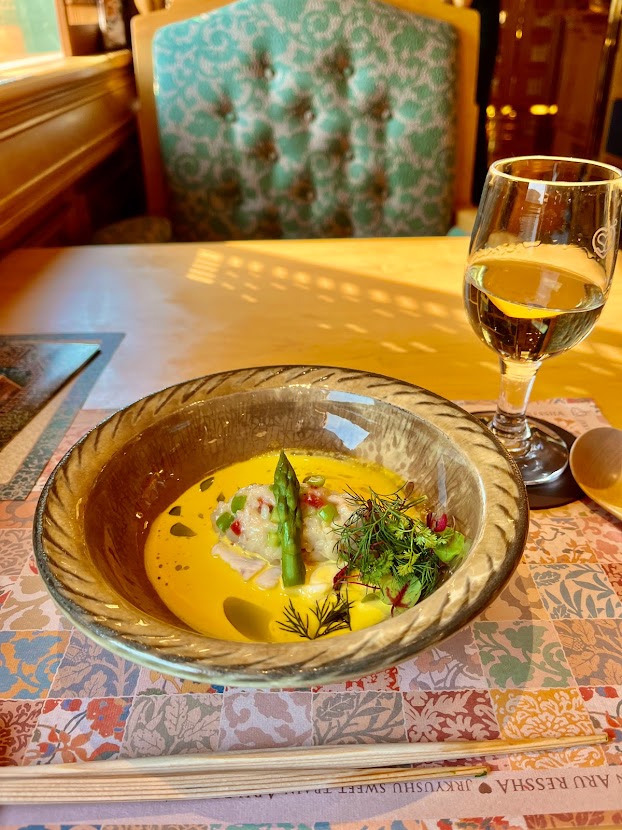 桜鯛と春のリゾット・サフラン風味のクラムチャウダー。実に美味し。これはワイン、白だよな。