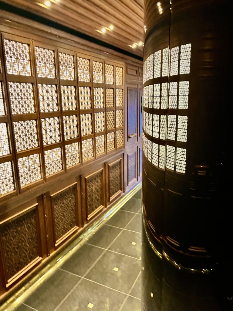 隣の車両の、ちょっとシックな感じの通路。デザインにとっても配慮がしてあるよな。