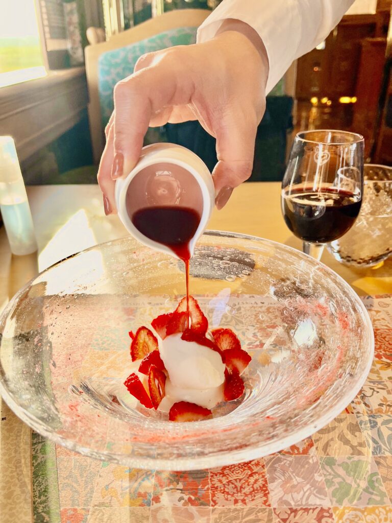 福岡産のあまおうミルク。最後にイチゴのシロップをかけますねと。なるほどな。赤ワインもいただいて、俺はかなり、ヘロヘロになってきたな。