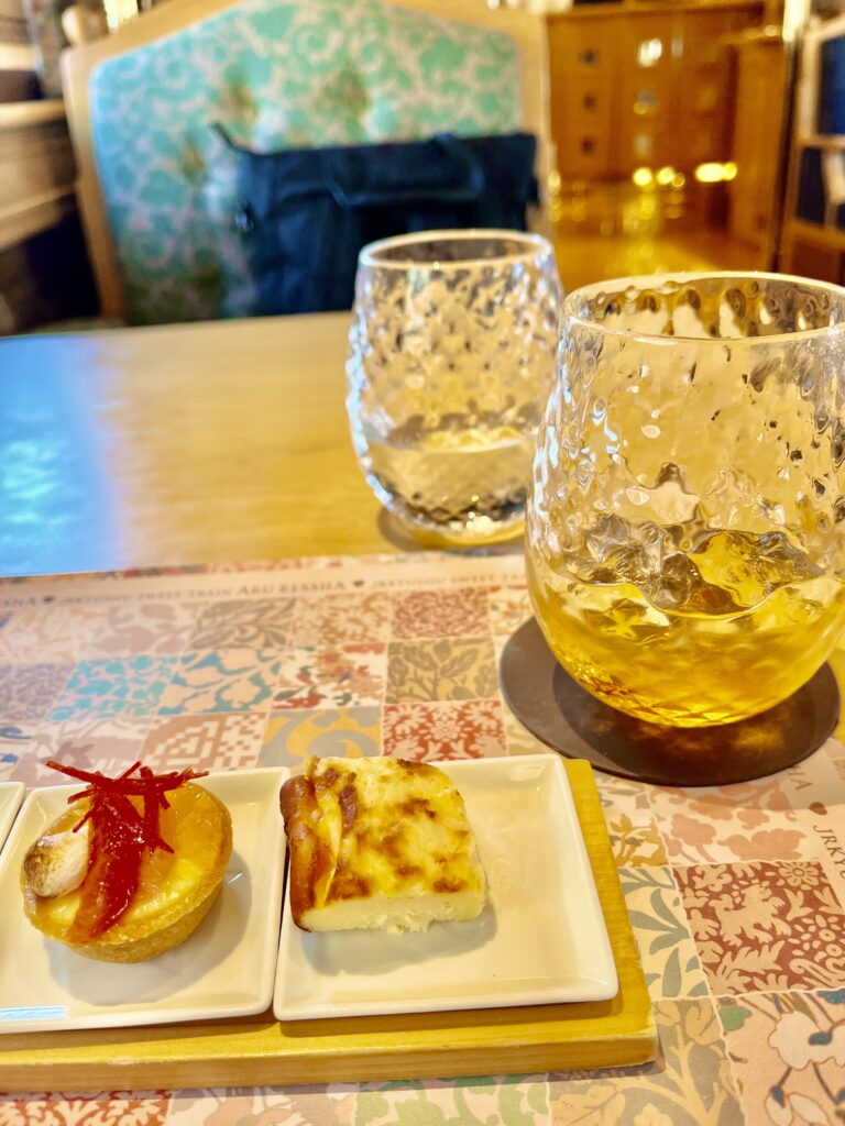 ミニスイーツ。左から、抹茶わらび餅(これは写ってませんね)・甘酸っぱいタルト・バスクチーズケーキ。飲み物は梅酒のロック。美味しな。