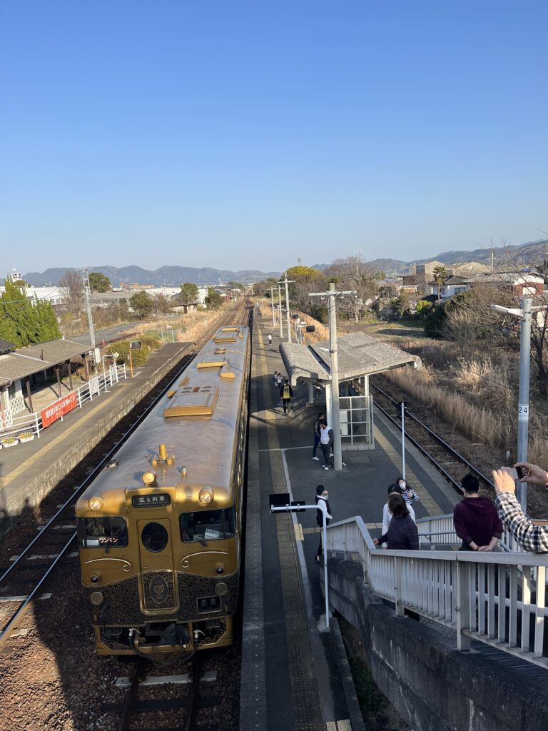 途中、筑後吉井駅に立ち寄る。列車から降りて、気分転換してくださいという主旨の停車。ちなみにこれが博多から由布院に行く列車では、駅の停車だったな。