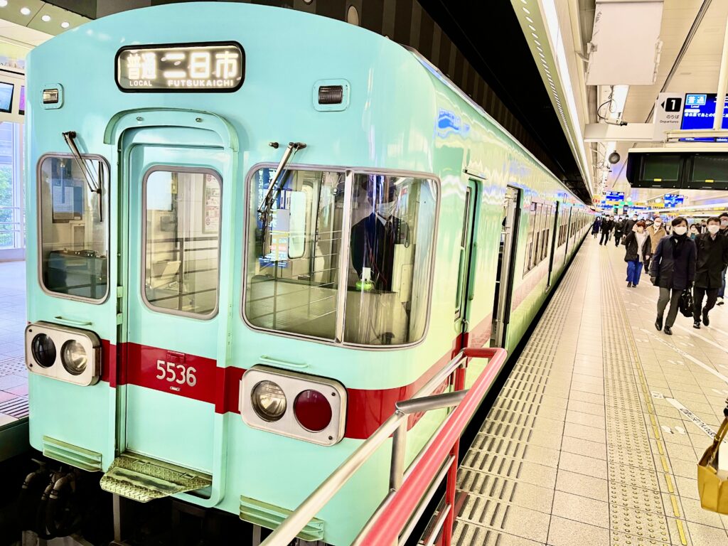 今回もまた、駅員さんのご厚意で西鉄・天神駅のホームに入れていただき、車両を眺めることができた。西鉄の博多終点駅では、どっと人が下りてくるんだな。