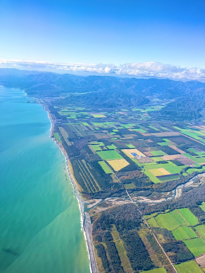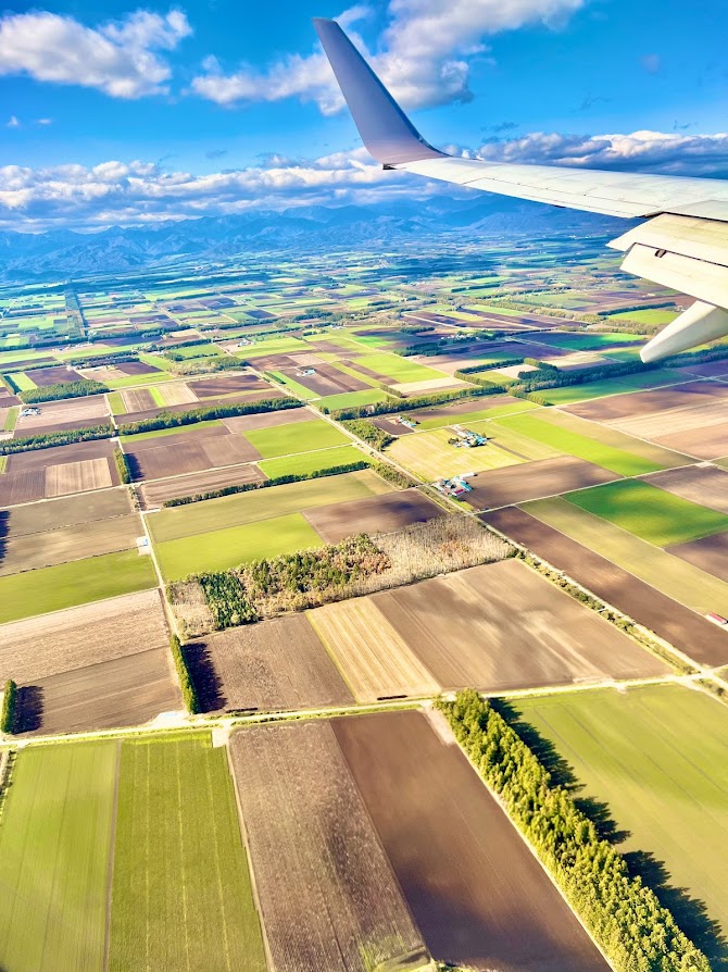 帯広が近くなる。太平洋側から、パッチワークの畑を眼下に見る。もうすぐ着陸だな。