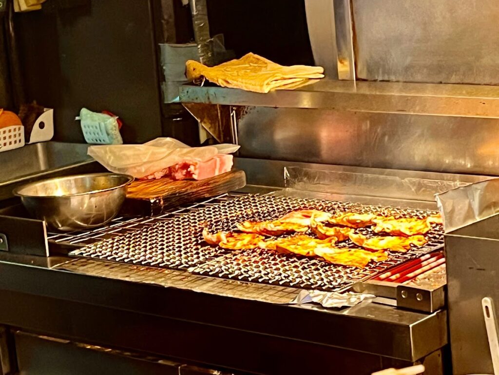 豚丼の肉を焼いているところ。本当は当然、焼いている方がいるわけだが、写真を撮ろうとすると、恥ずかしがっていなくなってしまった・・・