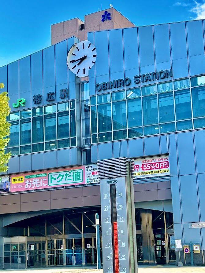 帯広駅、そしてその向こうに日航ホテルノースランド帯広が。