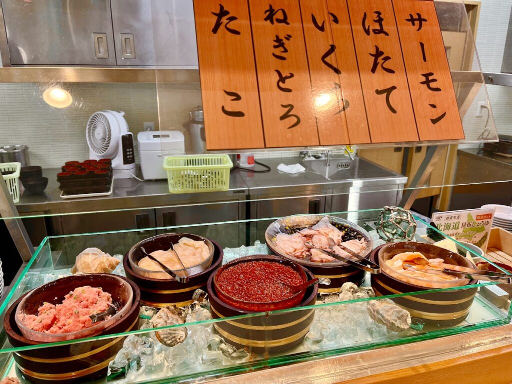 海鮮丼のコーナー。北海道のドーミーインでは、お約束だよな。