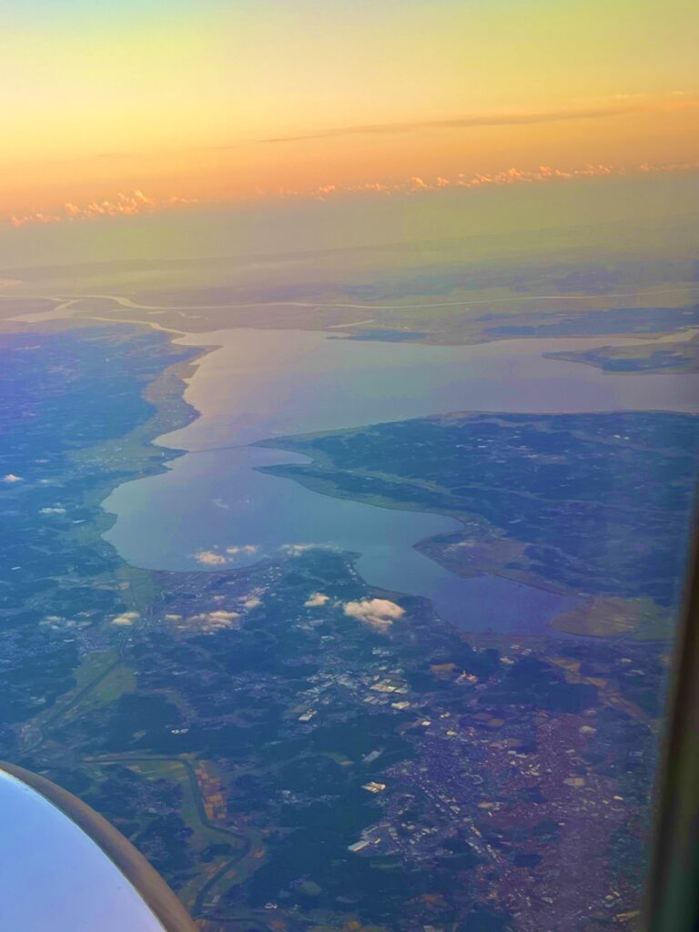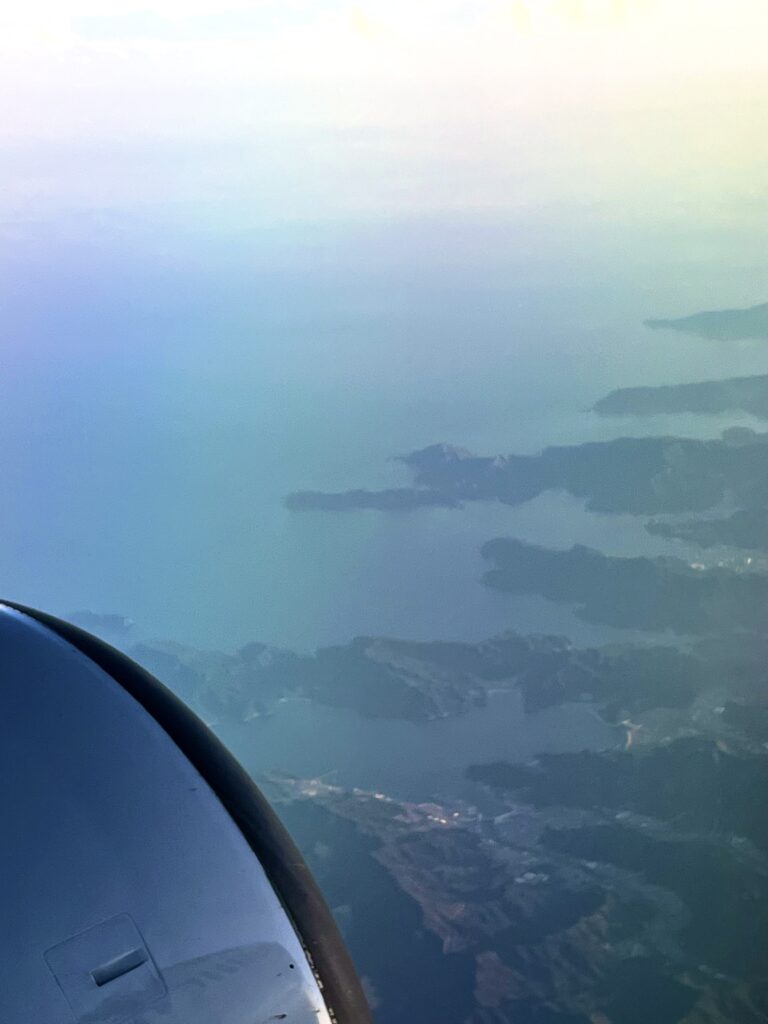 帰路のJALから見えた車窓。上は三陸、釜石当たりのリアス海岸。下は霞ケ浦。この景色は初めてだな。