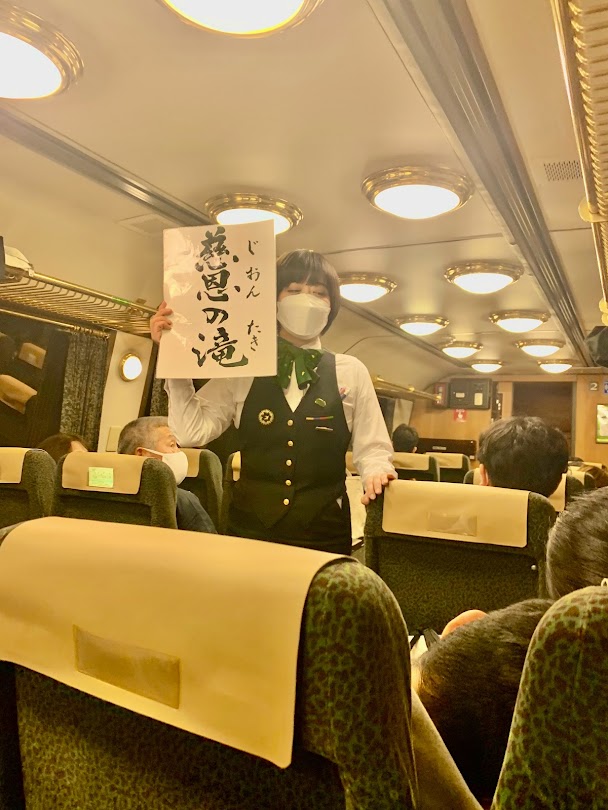 車中、アテンダントさんが、もうじき慈恩の滝が見えるとことに来て、ゆふいん3号は速度を落とします。ゆっくり眺めてくださいとのことだったが…