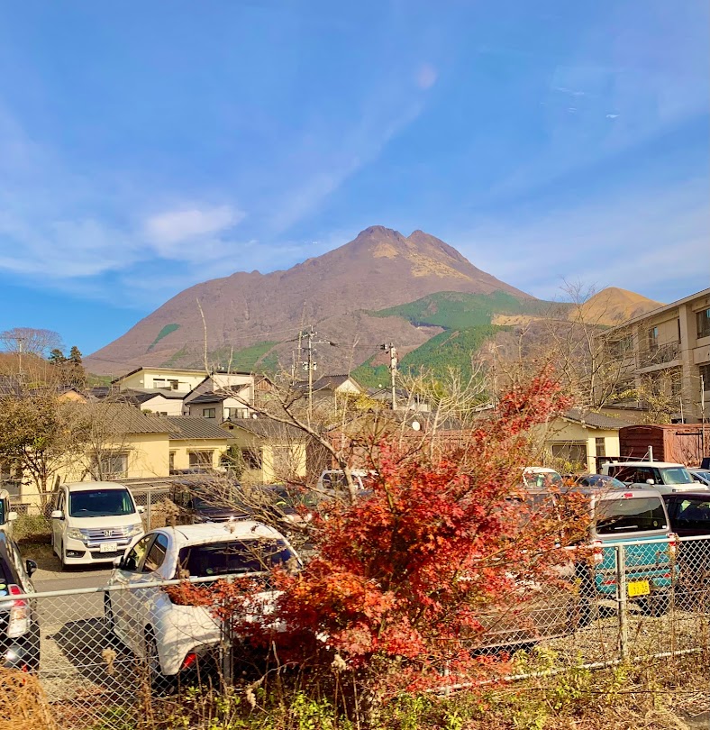 今度は座席を、進行方向右側から左側に移す。わずかだ紅葉してる。そして、由布岳が見えてきた。もうじき、湯布院だな。