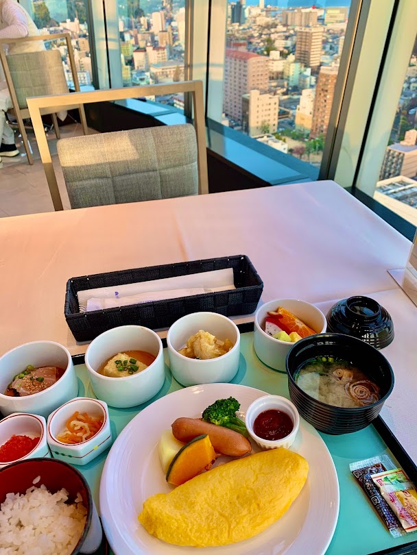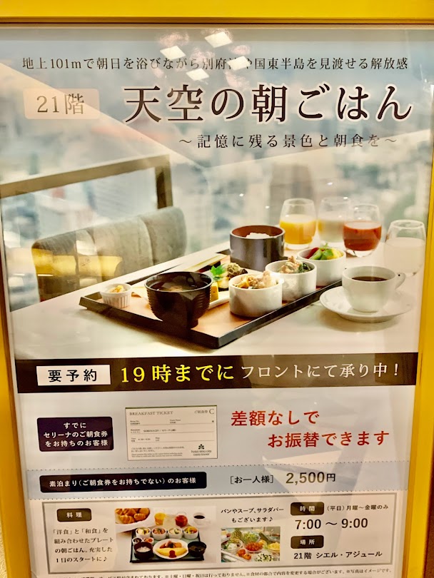 ホテルに戻ってきた。ホテルの朝餉。21階、天空のレストランでのお食事と。遠くに別府湾が見える。もともと、フレンチを食べれるレストランを朝食会場にしてくれてる。これは嬉しいおもてなしだよな。景色もきれいだし、もちろん朝餉も美味しな。別にビュフェもあるが、こちらではビュフェの料理をとりわけしてくれてるイメージ。これをこの上品なレストランでいただけるんだから、最高だよな。