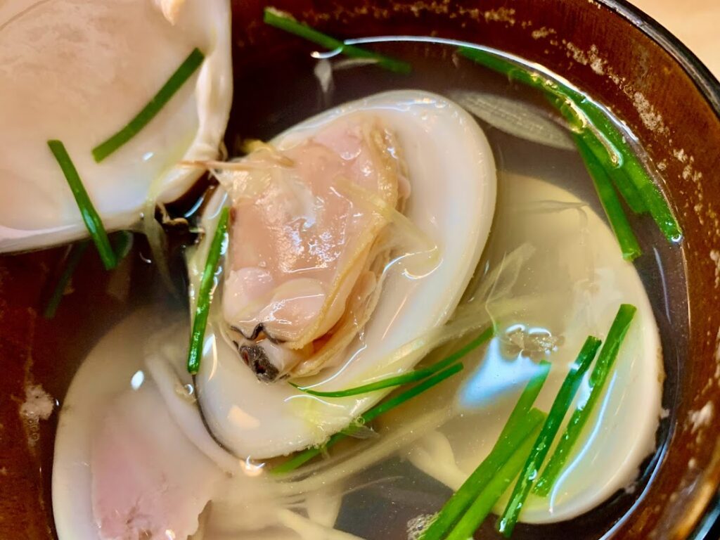 最後はハマグリの澄まし汁。ハマグリを食べた後は、この出汁をもとに雑炊をつくりましょうかと提案されたが、ここまででお腹がハチ切れそうと、遠慮させていただいた。この汁、冷めたものが少し残ったのでいただくと、それはそれはハマグリの濃厚な味が感じられた。ちょっと驚いたくらい。
