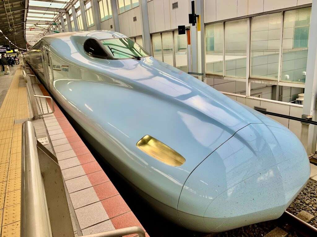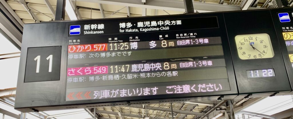 小倉に到着。ここからは在来線ではなく、九州新幹線で。特急「ひかり」。ただし東京からの車両ではなくこれは、新大阪発博多行きの、JR西日本車両。カッコ良いよな。