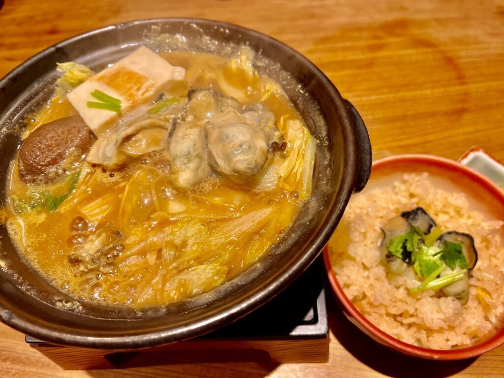 目玉は牡蠣の土手鍋。これがとんでもなく美味しな。右にある牡蠣ごはんは、土手鍋を食べ終わった後の汁に放り込み、全ていただいた。満腹だし、満足だ。