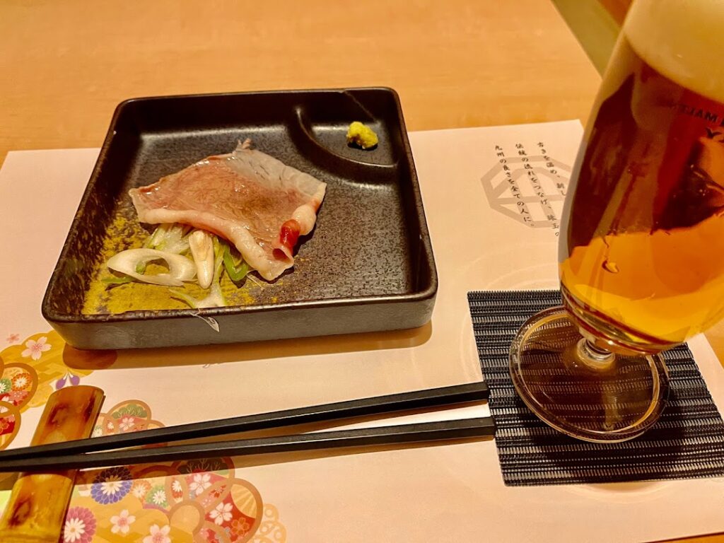 左は宮崎の炭火焼の鶏。右は大分名物のりゅうきゅう。両方とも美味しだ。ビールと良く合うって。