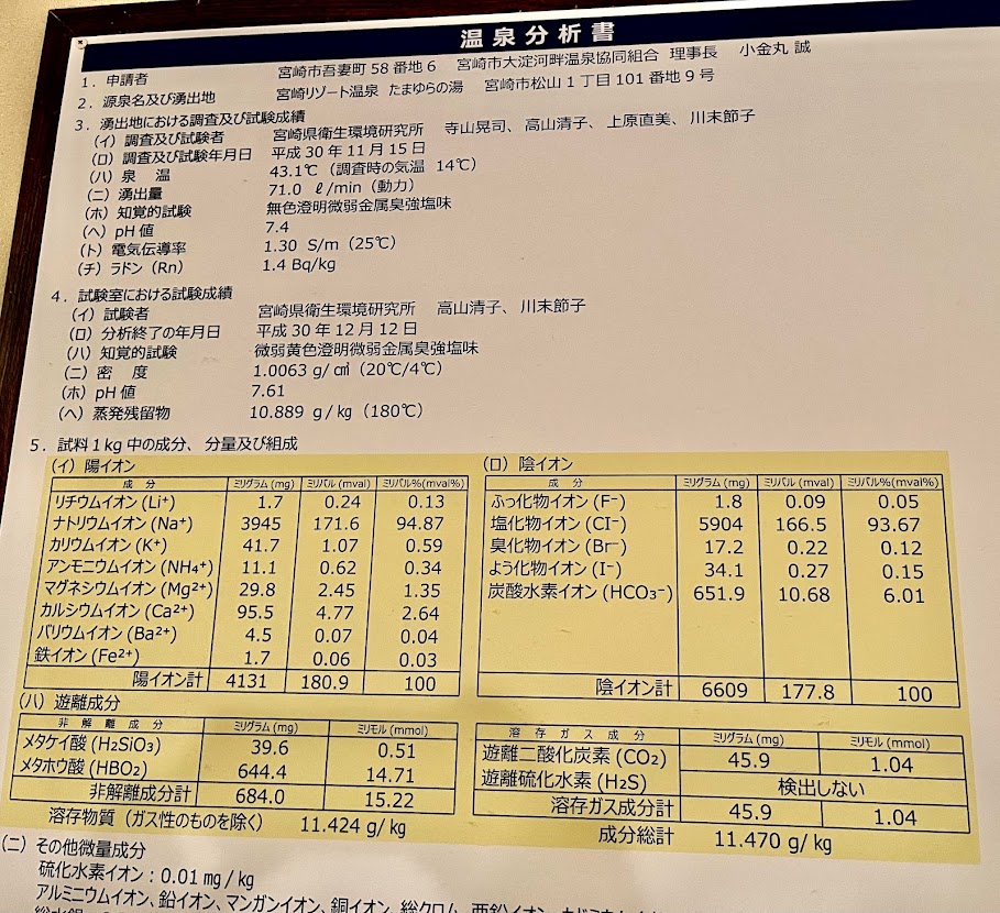 ここ、宮崎リゾート温泉たまゆらの湯の分析書。見ての通りですね。ラドン温泉だよな。良い気持ち!このホテルの魅力の一つですね。