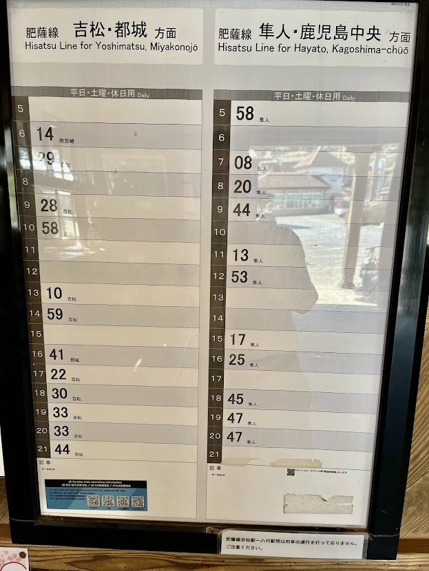 駅舎とホーム。趣があるよな。そして肥薩線・嘉例川駅の時刻表。列車はまばらだが…まあ、そこそこあるとも言えるよな。