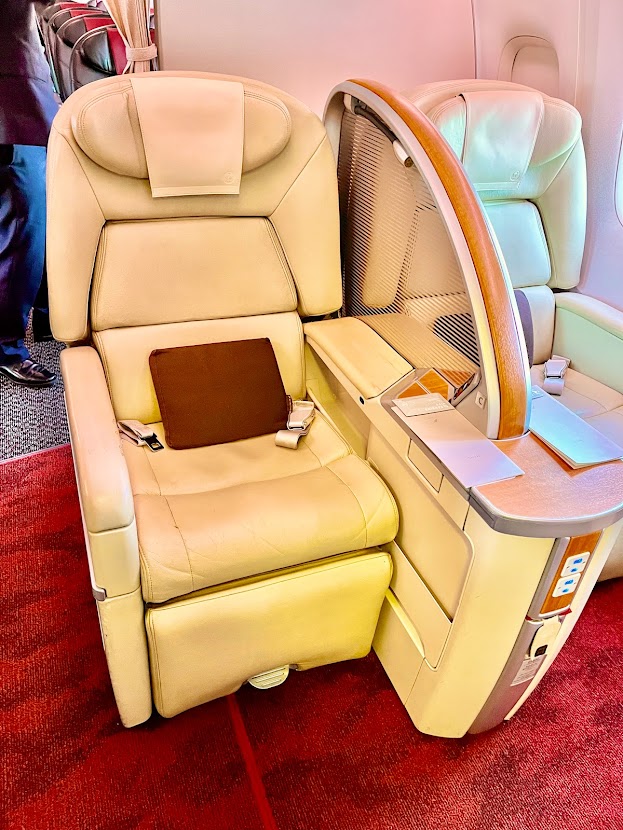 鹿児島空港に到着。これから羽田に向かうが、なんと、ファーストクラスに空きがあった。素直に嬉しい。現在のエアバスのファーストクラスは黒の革張りだが、写真の通り、こちらの座席は白の革張り。これはボーイング社製、最近では珍しい、新幹線のグランクラスみたいなやつだよな。この鹿児島-羽田便のファーストクラスは5席しかない一方、3名のCAさんが対応してくれた。5席とは、希少価値があるよな。