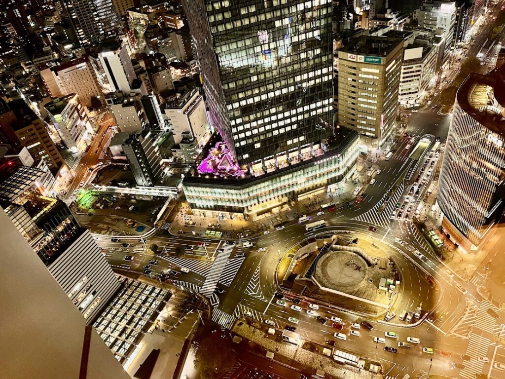 エリートラウンジから、大名古屋ビルジング方向を望む。これは初めて気が付いたんだが、名古屋のこちらの駅前、いわゆる「ラウンドアバウト」になってるんだな。
