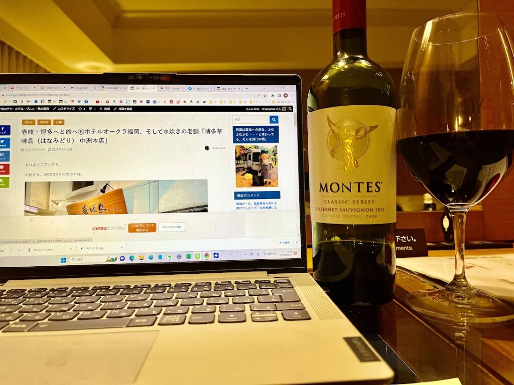 このブログを書きながら、ホテルの部屋で一人飲み。さすがホテルオークラ福岡、ワイングラスはリーデルのボルドー・グラスだった。