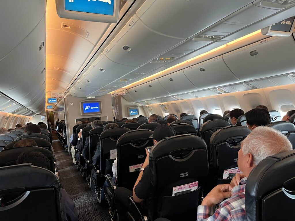 ファーストクラス、空席待ちは叶わなかった。機体が古めのボーイング747だったから、ファーストクラスは8席しかなかったしな。これはエコノミー席から見た、福岡15時発のJAL318便の機内。この日は火曜日、搭乗率は50%ぐらいかな。