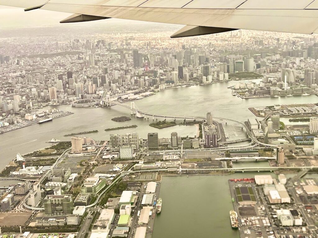 今日はいつもと違うコースを飛んでくれたみたいだ。西に向かう飛行機の窓からレインボーブリッジが見えるのは、結構、珍しいことなんだよな。