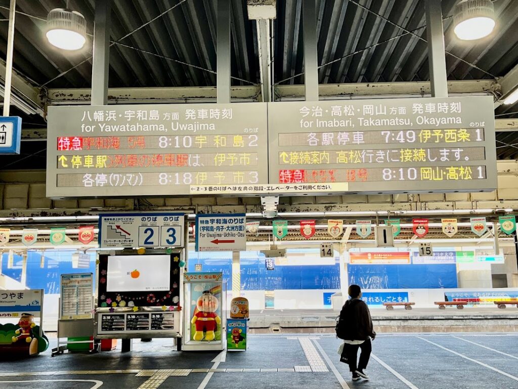 ホテルのビュフェ朝餉前の腹ごなし散歩。まずはJR松山駅へ。駅内には、じゃこ天うどん屋さんもあった。愛媛にいるんだなと実感する瞬間だよな。