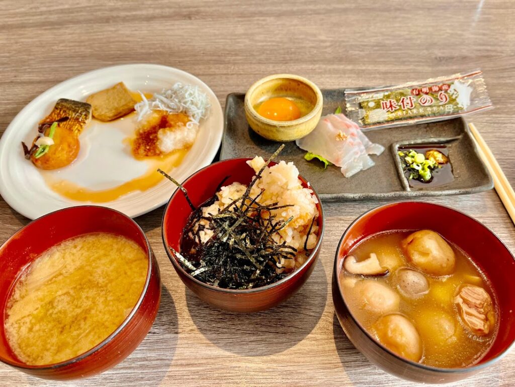 ホテルの外観、そしてビュフェ朝餉。真ん中の鯛めしが、とんでもなく美味しだったな。
