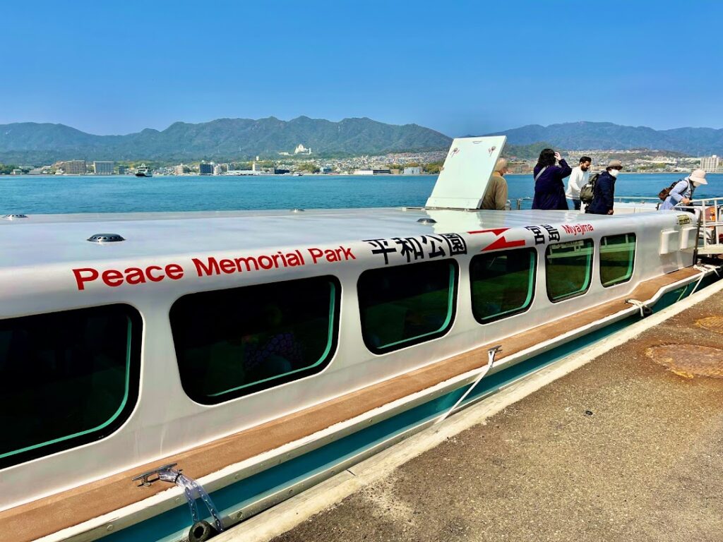 厳島神社の赤鳥居と、平和公園と宮島を結ぶ船。今日は天気がいいな。