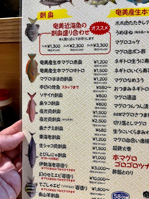 ちなみに海鮮ごっぱち(58)の名前の由来は、奄美大島の中心的な国道58号線近くで採れる食材を主に用いて料理を作っているからとのこと。「海鮮全集中」の一言が期待させますね。
