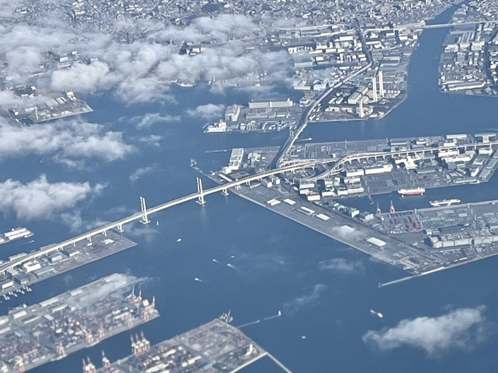 JALからの車窓。羽田空港、そして横浜ベイブリッジ。